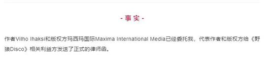 就是这个Ihaksi把歌曲的授权给了一个叫玛西玛国际传媒的公司,在《野狼Disco》爆火之后展开维权。